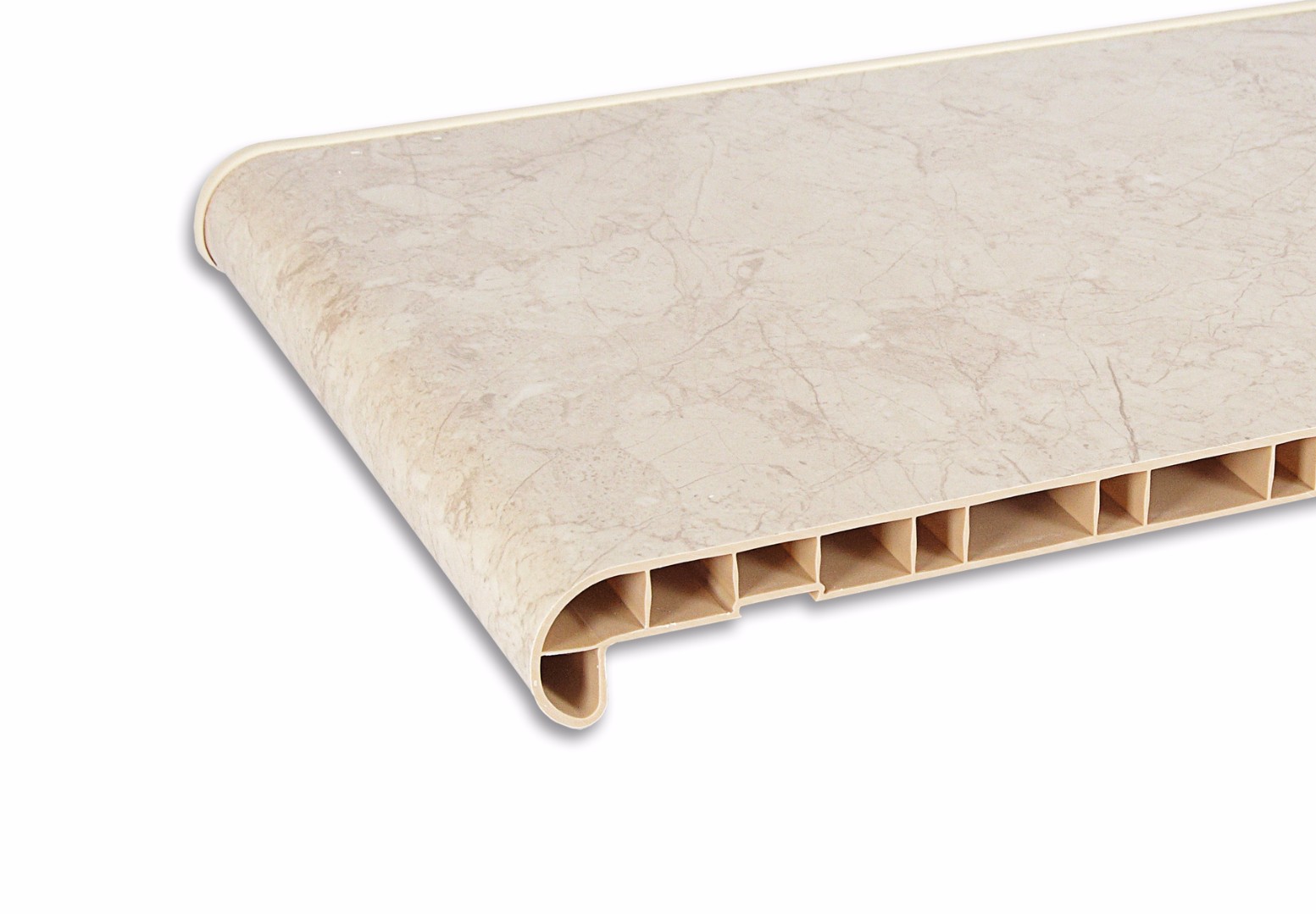 Массивность и солидность изделия соответствует отличному качеству. Первичный ПВХ применяется для изготовления профиля подоконника. Покрытие многослойной акриловой пленкой повышает стойкость к повреждениям. Внутренние перемычки профиля обеспечивают прочность подоконника.